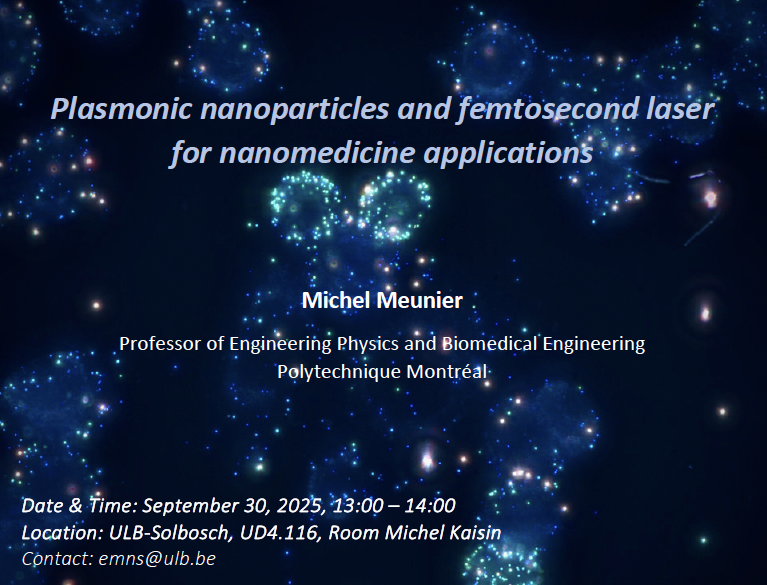 - Plasmonic Nanoparticles and Femtosecond Lasers for Nanomedicine Applications: A Seminar by Prof. Michel MeunierAugust 29, 2025The EMNS lab and LCO is pleased to host Prof. Michel Meunier, Professor of Engineering Physics and Biomedical Engineering at Polytechnique Montréal, for a seminar on cutting-edge applications of nanotechnology in medicine.