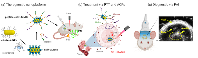 G. Bruylants is also developing, in collaboration with Dr. M. Retout, enzyme responsive contrast agents for photoacoustic imaging and delivery vectors. This project aims to develop an innovative, modular nanoplatform for cancer diagnosis and therapy through NIR‑II photoacoustic imaging (PAI), photothermal therapy (PTT), and controlled release of anticancer peptides (ACP). It focuses on advancing clinically translatable nanomedicine for personalized healthcare. Gold nanorods and silver nanotriangles, which absorb in the NIR‑II region where biological tissues show minimal absorption, will be functionalized with two peptide types using orthogonal chemistries: one for selective tumor targeting and one with therapeutic anticancer activity. These hybrid nanostructures will serve as thermal transducers for PTT and as contrast agents for NIR‑II PAI. Long‑term goals include integrating NIR‑II PAI into routine clinical imaging and combining targeted peptide delivery with low‑temperature photothermia as a novel cancer treatment strategy. Societal benefits include more effective and personalized therapies, especially for multidrug‑resistant cancers, as well as faster, more accessible, and lower‑cost diagnostics compared with MRI or X‑ray imaging.