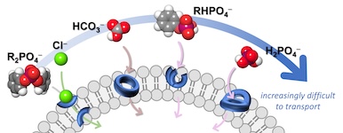 Most oxoanions are more strongly hydrated than chloride and thus very challenging to transport across lipid bilayers, However, oxoanions such as phosphate, phosphate esters, nucleotides, carboxylates, and bicarbonate are of high relevance in biology. Therefore, the development of synthetic anion receptors that can efficiently bind and transport these anions, as well as the developments of methods to study the transport of these anions (see also topic #4) is one of the main focusses of our research.
